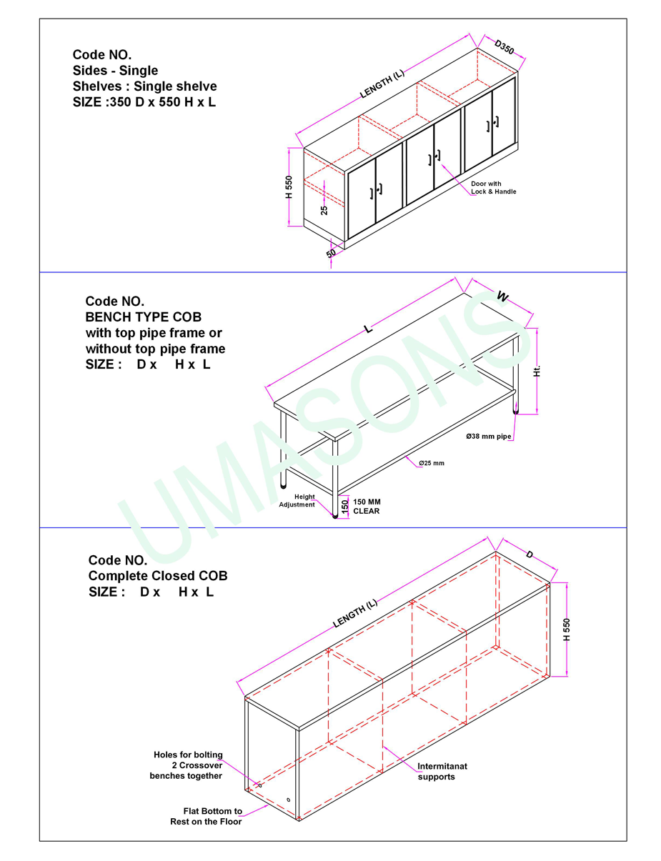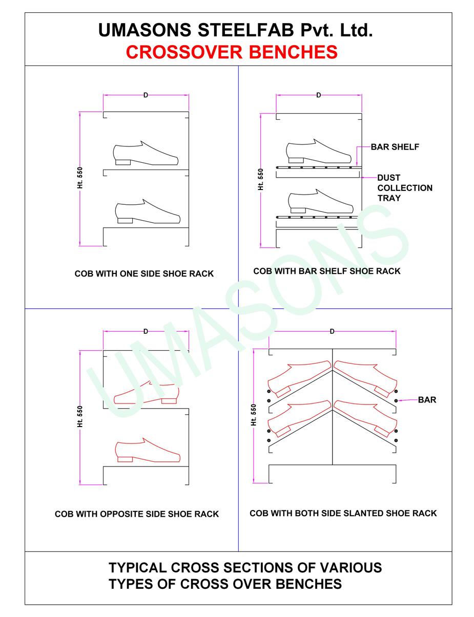 We can make a variety of cross-over benches,closed from all sides, Simple bench, one side shoe rack and other side closed, Both side shoe racks, Slanting shoe racks, ā Zā type shoe Bench and so on.